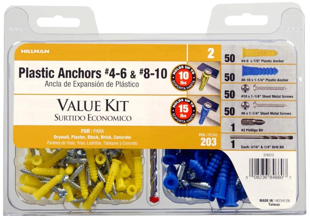 - Hillman #4-6 and #8-10 Value Kit includes plastic anchors, sheet metal screws, and two drill bits